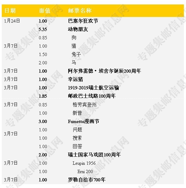 瑞士2019年上半年邮票发行计划 日期:2018-11-04 2018-11-4 来源:专题集邮信息网 内容简要:瑞士2019年上半年邮票发行计划 瑞士2019年邮票发行计划 瑞士2019年新邮发行计划...