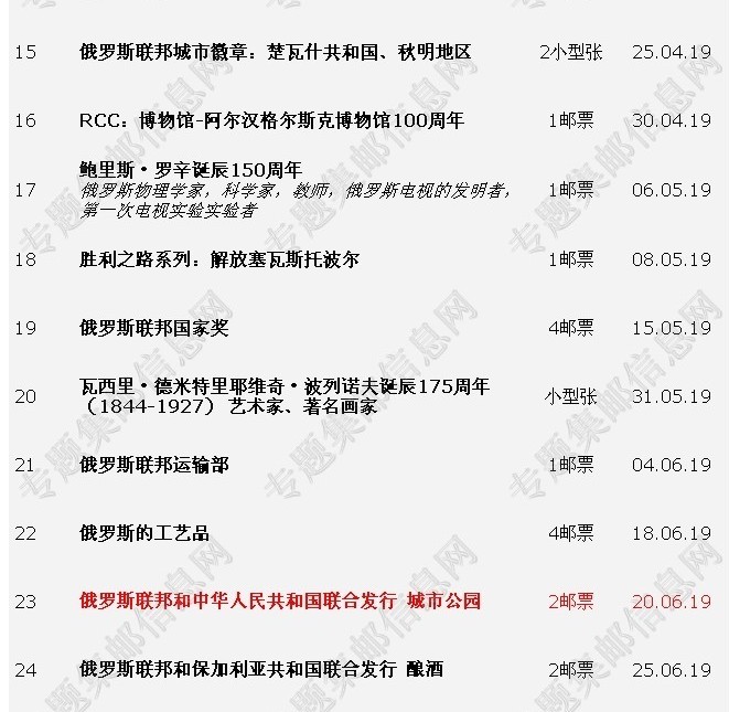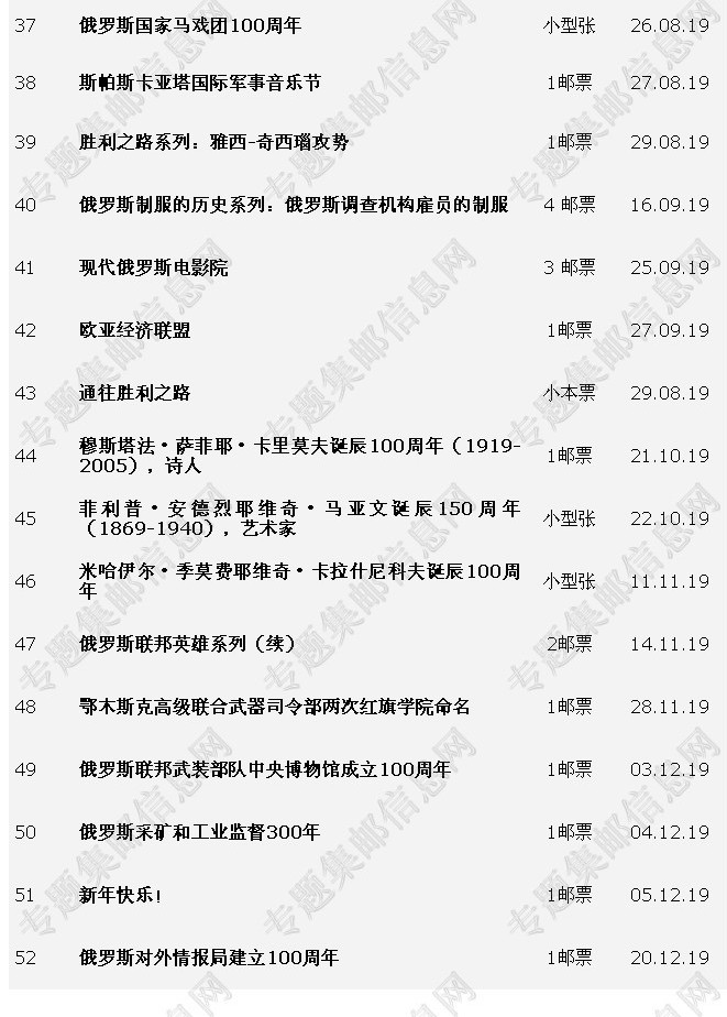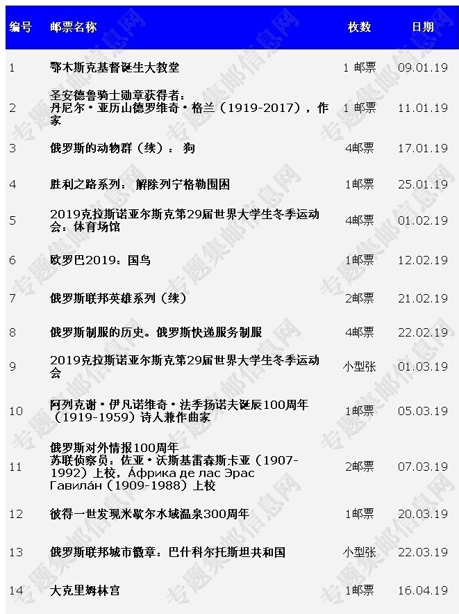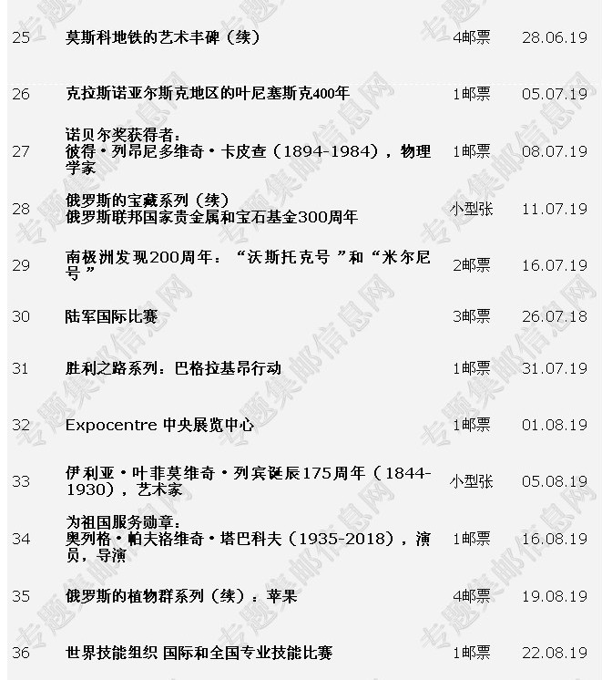 俄罗斯2019年新邮发行计划 俄罗斯2019年邮票发行计划...