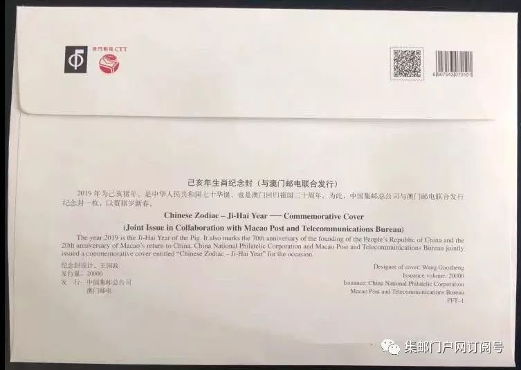 【延续封中封神话】总公司龙头1号封PFT-1《己亥年生肖猪票与澳门联合发行纪念生肖封》一号封发行(图) 日期:2019-01-23 集邮门户网订阅号 今天 PFT--1 龙头1号封 点下面“阅读原文”可直接购买(可原地实寄),全年总公司特种封实寄订户自动供应,散户只供应5套,售完为止!