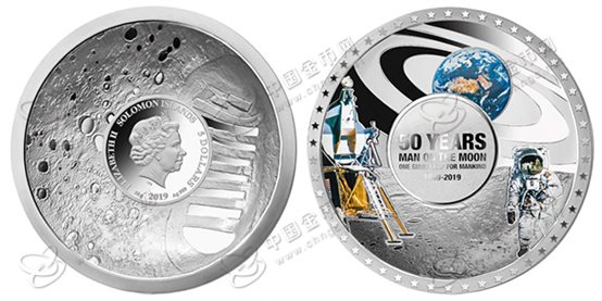 为纪念人类首次登月50周年,所罗门群岛发行了“人类首次登月50周年”弧面彩色纪念银币一枚。该币为所罗门法定货币,由澳大利亚皇家造币厂铸造。