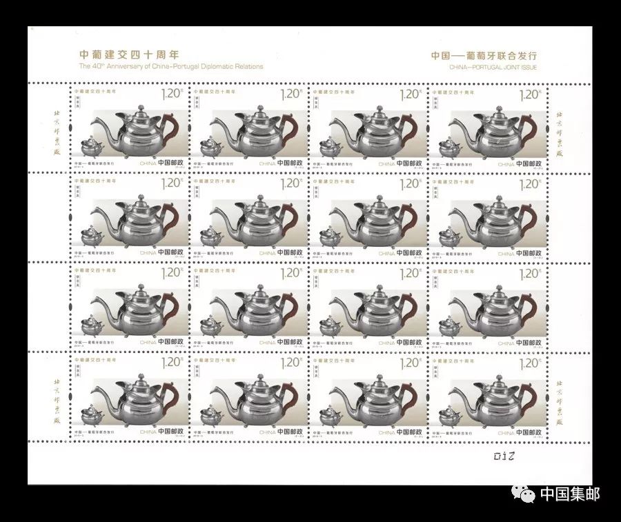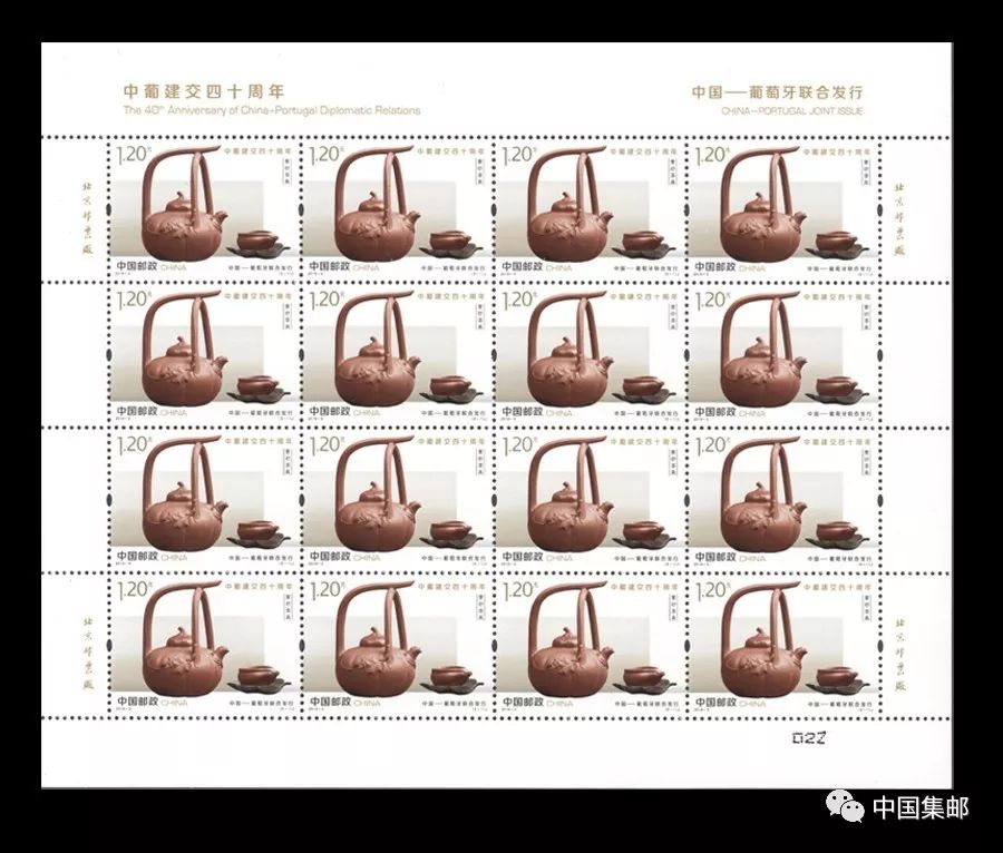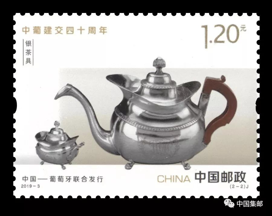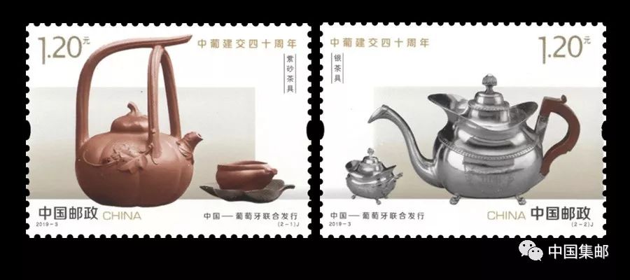 中国邮政定于2019年2月8日发行《中葡建交四十周年》纪念邮票1套2枚(与葡萄牙联合发行),图案名称分别为:紫砂茶具、银茶具,全套邮票面值2.40元。