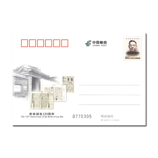 中国邮政定于2019年2月3日发行《老舍诞生120周年》纪念邮资明信片1套1枚。详情如下: