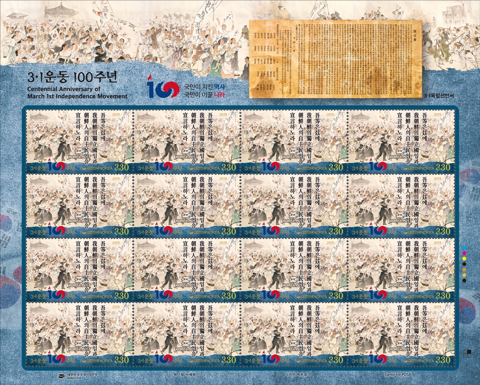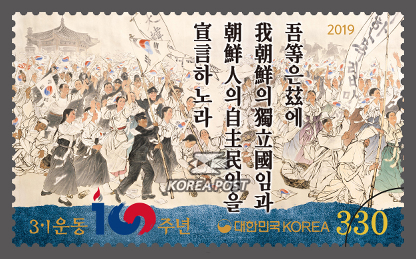 邮票文字为《己未独立宣言》开篇语:吾等兹宣言:我朝鲜之为独立国,朝鲜人之为自主民,以此告于世界万邦...
