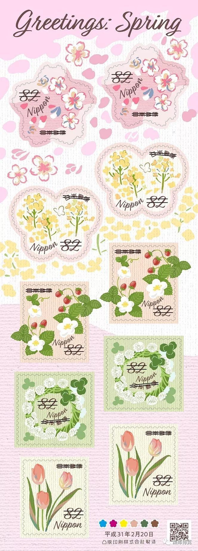 2019年2月20日,日本邮政发行一套《春季问候》邮票,包括两枚小版张10种20枚邮票,花鸟图案设计色彩淡雅,属于典型的日本风格。