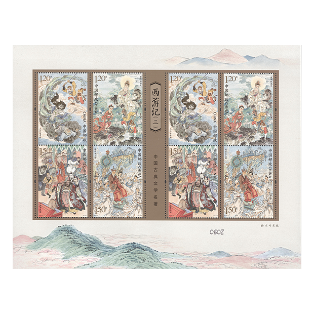中国邮政定于2019年4月20日发行《中国古典文学名著——〈西游记〉(三)》特种邮票1套4枚,小型张1枚。详情如下: 志号:2019-6 图 序 图 名 面 值 (4-1)T 三打白骨精 1.20元 (4-2)T 智斗红孩儿 1.20元 (4-3)T 斗法车迟国 1.50元 (4-4)T 情阻女儿国 1.50元 小型张 众神收青牛 6元 邮票规格:38×50毫米 齿孔度数:13×13.5度 整张枚数:版式一 16枚 版式二 8枚(2套) 整张规格:版式一 180×240毫米 版式二 200×156毫米 小型张邮票规格:95×68毫米 小型张外形规格:138×93毫米 小型张齿孔度数:13×13.5度 版 别:影写 防伪方式:防伪纸张 防伪油墨 异形齿孔 荧光喷码 设 计 者:李云中 版式二边饰设计者:夏竞秋 版式二边饰资料提供:李云中 责任编辑:王静 印 制 厂:北京邮票厂 出售办法:自发行之日起,在全国指定邮政网点、集邮网厅(http://jiyou.11185.cn)、中国集邮手机客户端和中国集邮微信商城出售,出售期限6个月。 另制作四方连邮票折:成品规格114×164毫米,面值21.60元,专用于中国集邮总公司邮品。四方连邮票折设计者:夏竞秋。四方连邮票折资料提供:李云中。 |