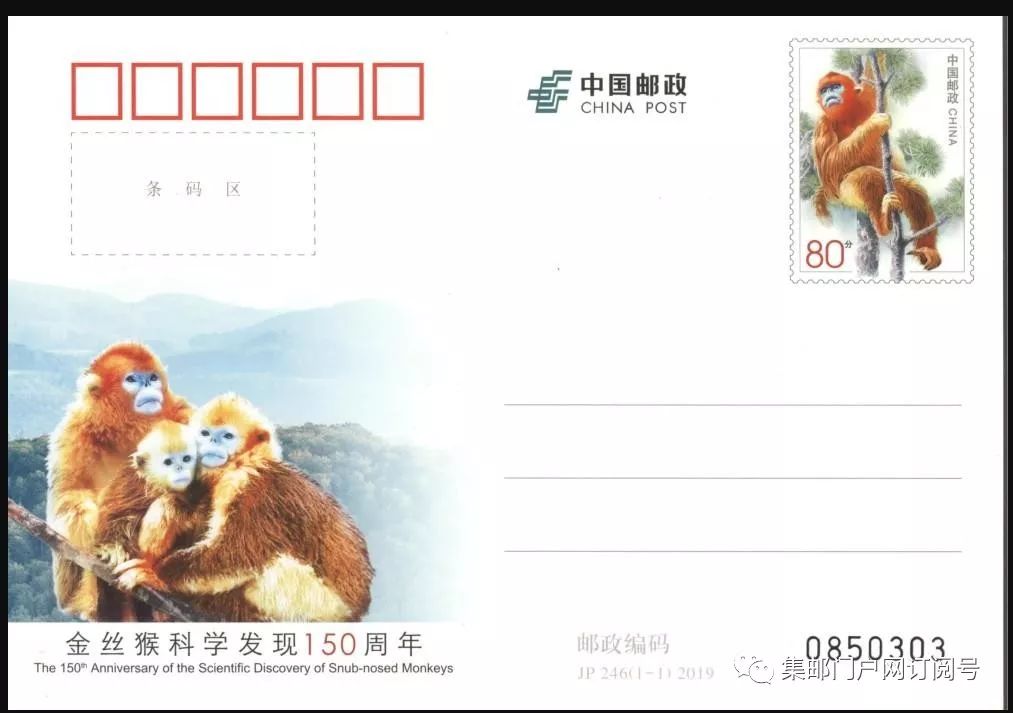 中国邮政定于2019年4月27日发行《金丝猴科学发现150周年》纪念邮资明信片1套1枚。集邮门户网讯详情如下: