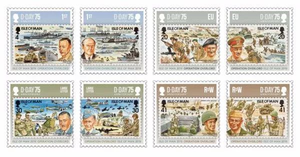 2019年4月22日,马恩岛发行1套8枚邮票纪念诺曼底登陆75周年。这套邮票在设计上非常“取巧”,采用票中票形式,图案采用了1994年发行的诺曼底战役50周年纪念邮票,主角为艾恩豪威尔等英美盟军高级将领。