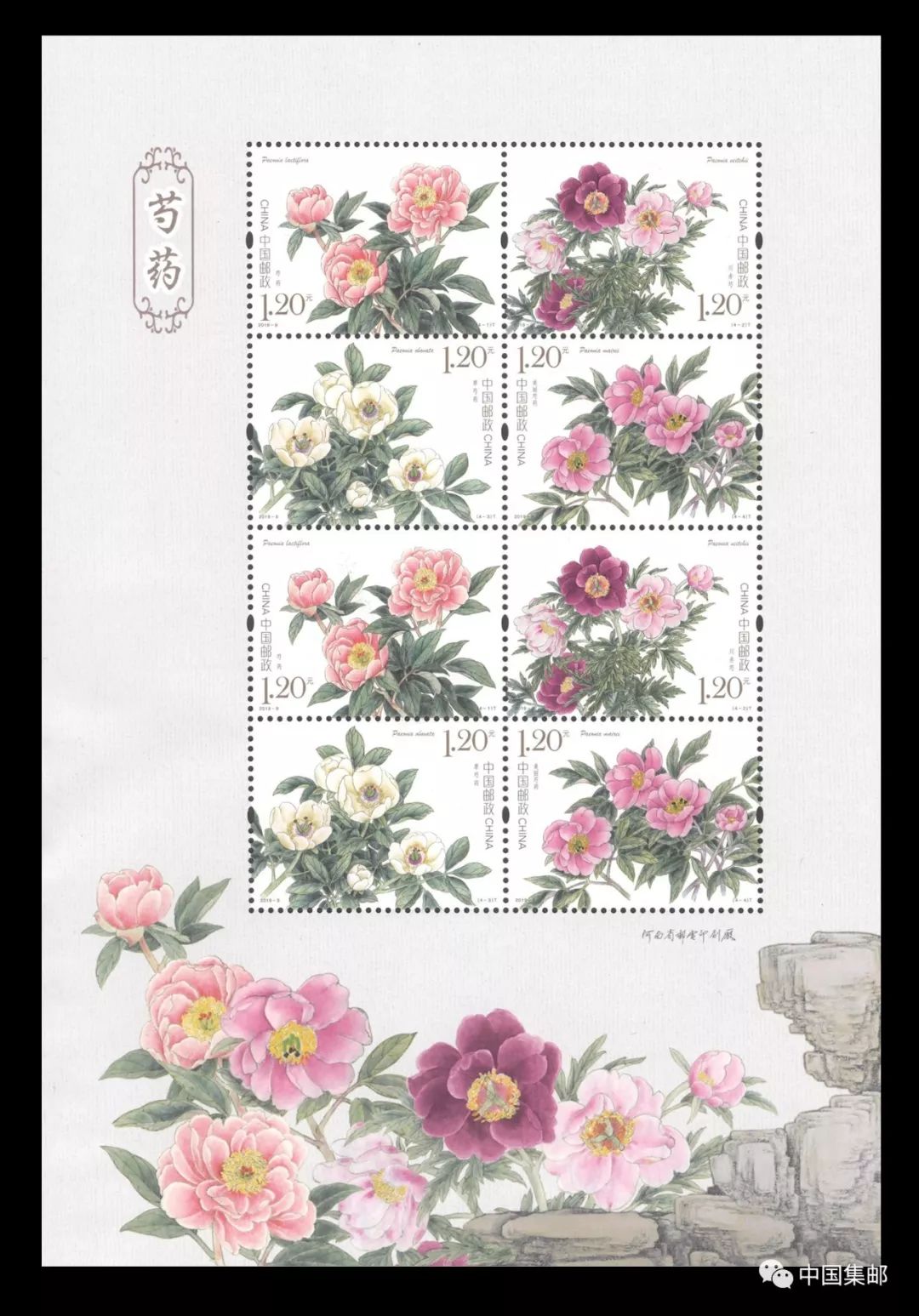 中国邮政定于2019年5月11日发行《芍药》特种邮票1套4枚,邮票图案名称分别为:芍药、川赤芍、草芍药、美丽芍药,全套邮票面值为4.80元。