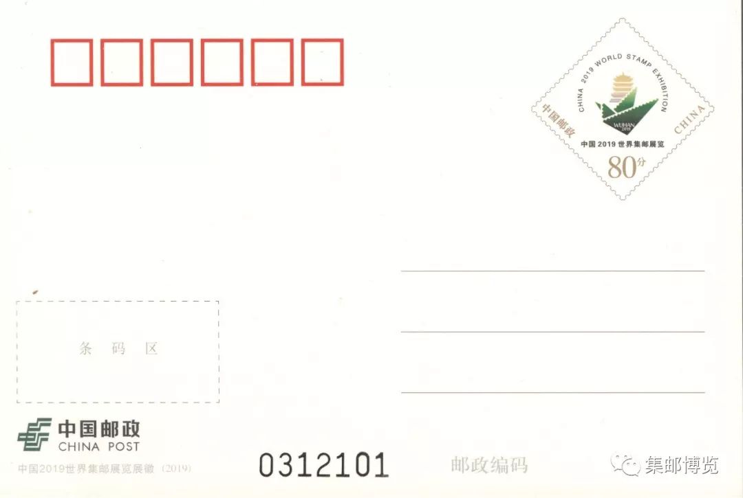 中国邮政定于2019年5月20日发行《中国2019世界集邮展览展徽》普通邮资明信片1套1枚。明信片规格为148毫米×100毫米,明信片邮票面值80分。邮资图主图是中国2019世界集邮展览展徽。