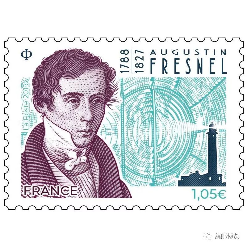 2019年5月6日,法国邮政发行一枚邮票纪念现代光学之父奥古斯汀·菲涅耳(Augustin Fresnel,1788-1827)。菲涅耳的科学成就主要有两方面:一是衍射,他以惠更斯原理和干涉原理为基础,用新的定量形式建立了以他们的姓氏命名的惠更斯-菲涅耳原理。另一成就是偏振:他与阿拉戈一起研究了偏振光的干涉,肯定了光是横波;发现了圆偏振光和椭圆偏振光,用波动说解释了偏振面的旋转。邮票图案表现的是将菲涅尔透镜原理应用于灯塔的设计。和早期的透镜相比,菲涅耳透镜更薄,因此可以传递更多的光,使得灯塔即使距离相当远仍可看见。