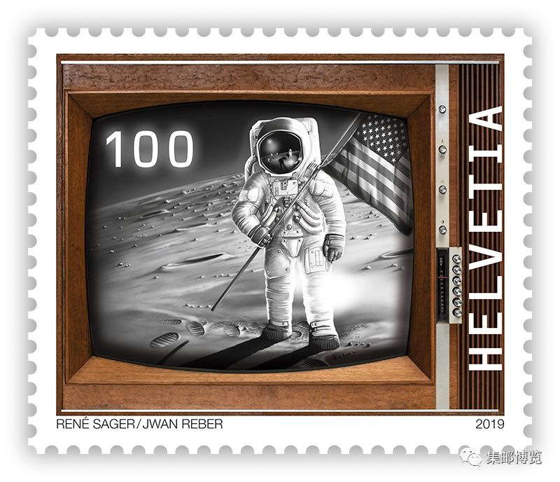 2019年5月2日,瑞士邮政发行一枚邮票,纪念1969年7月21日美国宇航员尼尔-阿姆斯特朗成功登月50周年。当时全世界有大约六亿人观看了电视转播。瑞士这枚邮票的图案也采用了电视机中的转播场景。这种设计让质疑这次登月的人士也无话可说了,因为大家确实是从电视上看到的登月图像。