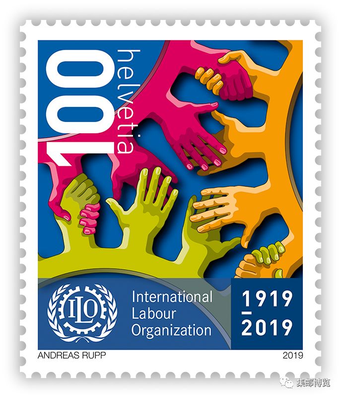 2019年5月2日,瑞士邮政为国际劳工组织ILO成立100周年发行一枚纪念邮票。国际劳工组织是1919年根据《凡尔赛和约》作为国际联盟的附属机构成立的。 1946年12月 14日,成为联合国的一个专门机构。这枚邮票所传达的理念是:劳工事务需要政府、工人和雇主的三方协作。