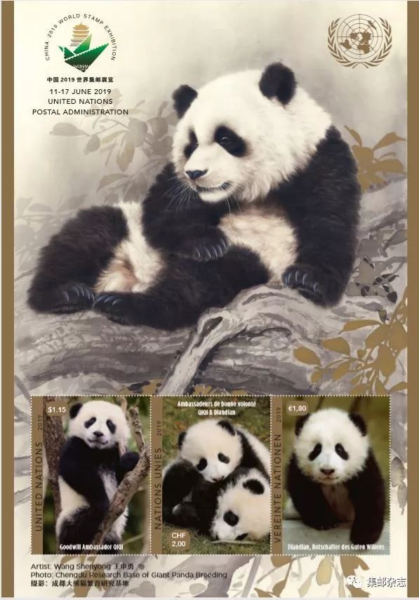 今天,联合国邮政公布了这枚小全张的最终图稿。小全张邮票画面采用中国成都大熊猫繁育基地提供的“启启”和“点点”的照片,表现它们在幼年时的可爱形象;背景画面为成都画家王申勇的作品。该邮票小全张将于6月11日在武汉展览现场及全球其他市场同步上市。