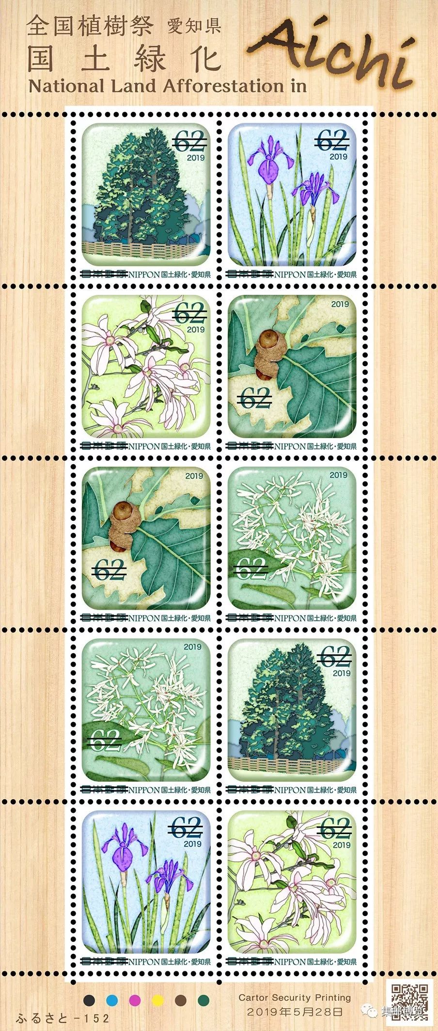 2019年5月28日,日本邮政发行一套5枚今年的《国土绿化》系列乡土邮票,今年轮到爱知县,该县的县花——燕子花是其中一枚邮票的图案。日本于1933年就确定了“爱林日”, 1950年确定确定植树节。以后每届植树节都在不同的地区举办,邮票也以不同地区的造林为主图,1992之前由国家发行,1992年由福冈地方邮政发行,1993年到2000年恢复国家发行,2001年开始,再次归地方邮政发行,成为乡土系列之一。