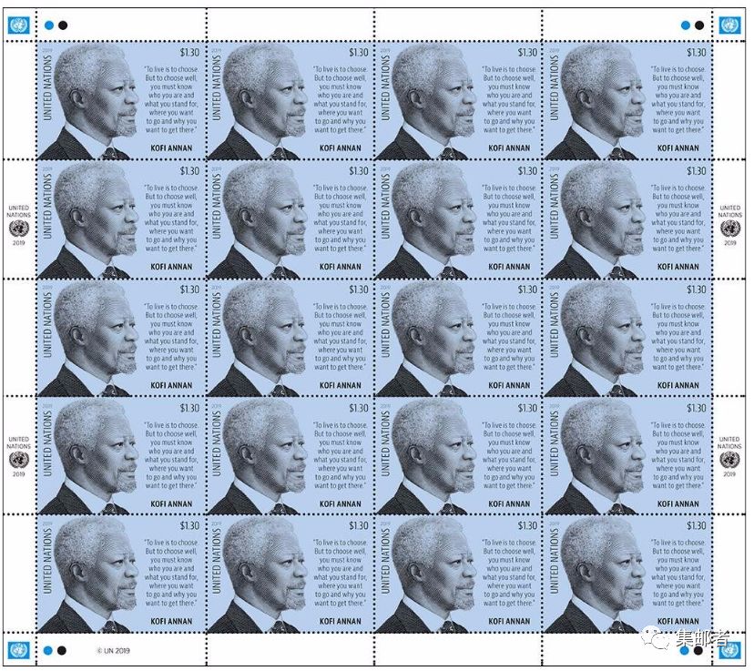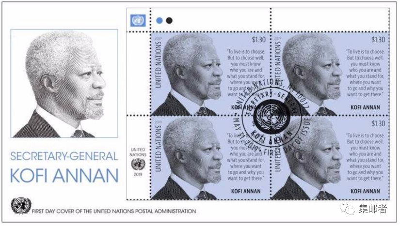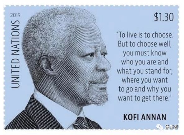 集邮者讯,联合国邮政将于5月31日发行新邮"科菲·安南"普通邮票1枚,集邮者平台也将近期开启预售,这枚邮票由马丁·莫克设计,虽然是胶版印刷,但细致程度依然"马丁莫克"。