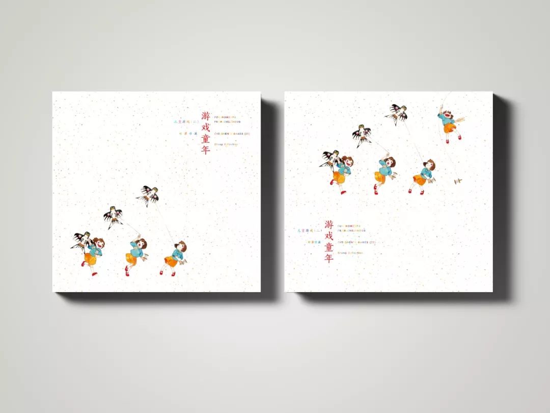 邮折封面选用景绍宗绘制的儿童放风筝的场景,分镜头感的一组放风筝的分解动作充满了童趣。最后儿童飞起的画面透着一股童话般的天马行空。为了突出绘画的手绘感和亲切感,底纹采用了洒金的效果。