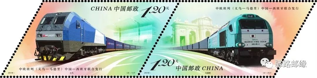 中国邮政定于2019年6月15日发行《中欧班列(义乌—马德里)》特种邮票1套2枚(与西班牙联合发行)。详情如下:
