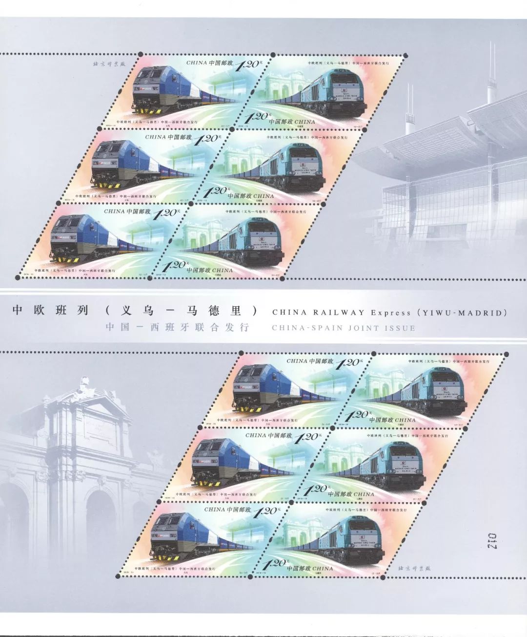 该套邮票为中国邮政与西班牙邮政联合发行。邮票根据画面内容采用了平行四边形规格,前景图案分别表现了从中国义乌和西班牙马德里出发的两列火车,背景图案分别为义乌小商品城和马德里代表性建筑——阿尔卡拉门。画面下方白色的铁轨组成了经纬线的形状,寓意中欧班列跨越千山万水将两国紧紧相连。