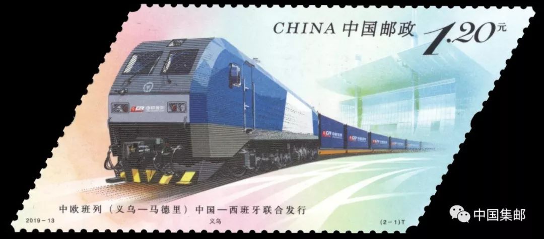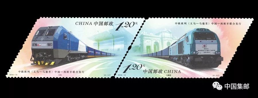 中国邮政定于2019年6月15日发行《中欧班列(义乌—马德里)》特种邮票1套2枚,邮票图案名称分别为:义乌、马德里,全套邮票面值为2.40元。