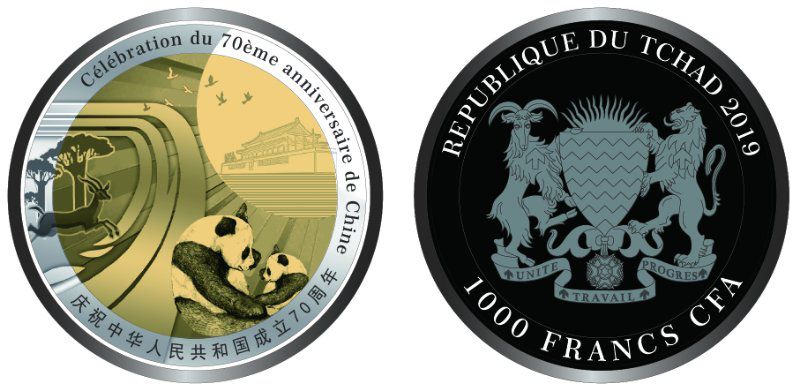 为庆祝中华人民共和国成立70周年,乍得共和国将于7月1日,发行双金属精制纪念币一枚。