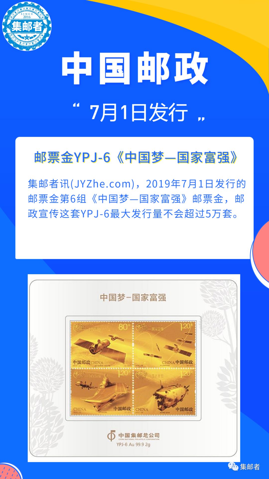 集邮者讯,7月份中国将发行9种邮品,1种纪念币,其中中国再次发行邮票金系列的第六组YPJ-6《中国梦-国家富强》,或许因除YPJ-1四猴邮票金有一定涨幅外,其它邮票金都在深度打折的情况下,中国邮政宣传上这套邮票金的发行量将降至5万套,不知道能否破除打折的魔咒!