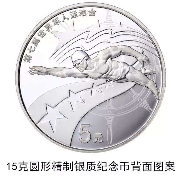15克圆形银质纪念币背面图案为游泳运动造型,衬以船舵及会徽相关图形元素组合设计,并刊“第七届世界军人运动会”字样及面额。