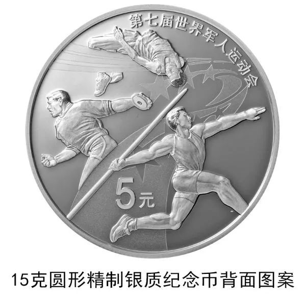 15克圆形银质纪念币背面图案为标枪、铁饼、跳高运动造型,衬以会徽相关图形元素组合设计,并刊“第七届世界军人运动会”字样及面额。