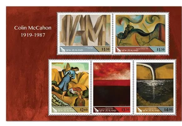 2019年7月3日,新西兰邮政发行一套5枚邮票和一枚小全张,纪念画家柯林·麦卡宏(Colin McCahon,1919—1987)诞辰百年。麦卡宏被公认为新西兰最重要的画家、思想家、策展人和评论家。麦卡宏的作品涵盖了多重题材和风格,他将现代主义绘画的各个方面融汇到特定的地域性环境,使他成为20世纪艺术中的一个独特人物。