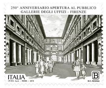 2019年6月24日,意大利邮政为乌菲兹美术馆开馆250周年发行一枚纪念邮票。在世界上所有的美术馆中,乌菲兹以其丰富的意大利文艺复兴绘画作品收藏而独具特色。整座博物馆建筑最初是按美第奇家族的柯西摩一世的旨意建造的,最初用来作为佛罗伦萨公国政务厅办公室(办公室在意大利语中发音为乌菲兹)。这座由著名画家和建筑设计师G·瓦萨利督造的建筑本身就是一个文艺复兴建筑杰作。