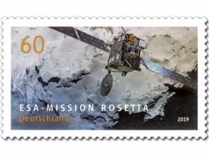 2019年7月1日,德国邮政发行一枚《天体物理学》系列邮票,主题为罗塞塔号彗星探测器。罗塞塔号彗星探测器是欧洲空间局组织的无人太空船计划中的项目,2004年3月2日7时17分发射,飞往楚留莫夫-格拉希门克彗星(代号为67P)。探测器以罗塞塔石碑命名,主要任务是探索46亿年前太阳系的起源之谜,以及彗星是否为地球“提供”生命诞生时所必需的水分和有机物质。2004年11月13日凌晨,在经历了长达7个小时的漫长等待后,由罗塞塔彗星探测器释放的“菲莱”着陆器成功登陆67P彗星。2016年9月30日,罗塞塔号彗星探测器在德国工程人员的操作指令下撞向67P彗星,随即罗塞塔号与地面失去联系,正式结束了长达12年的“追星”之旅。