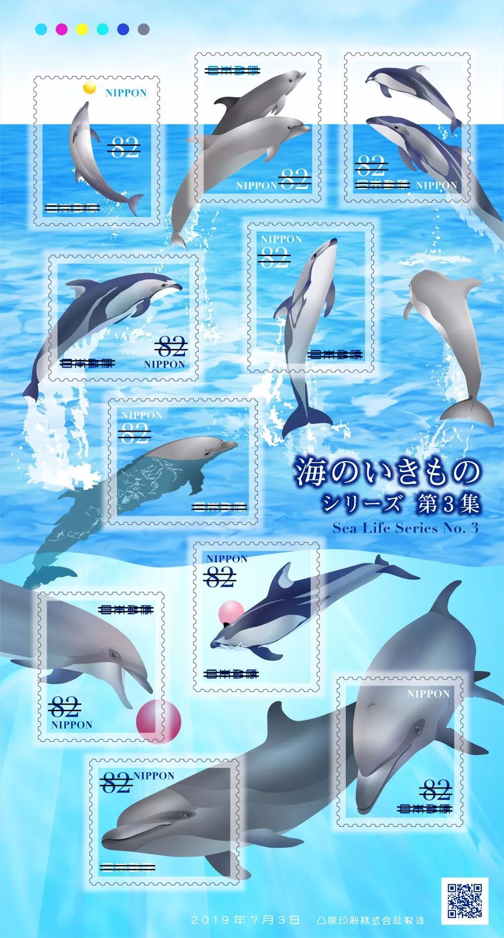 2019年7月3日,日本邮政发行一套10枚《海洋生命》系列第三组邮票,主题为海豚。这套邮票在印制过程中采用了特殊的光油,使得海水更加具有质感。