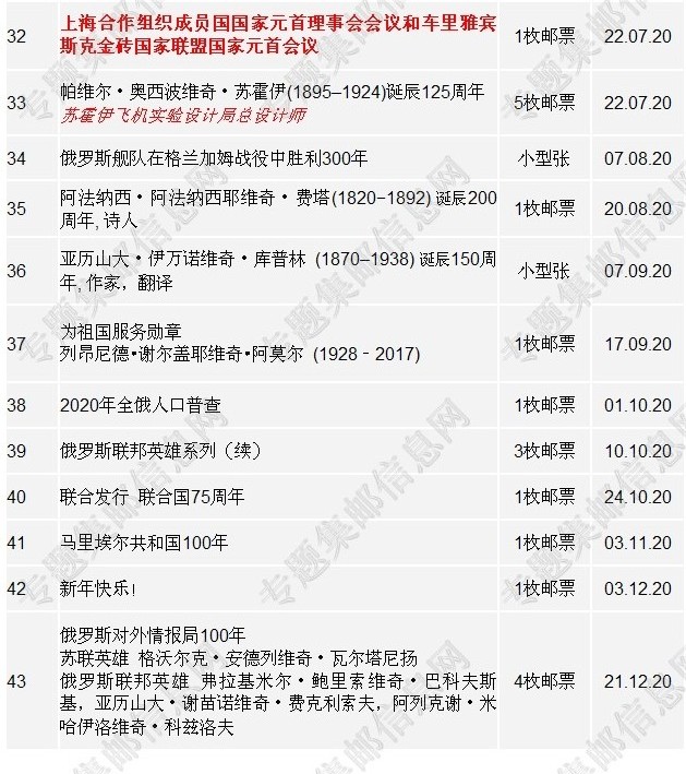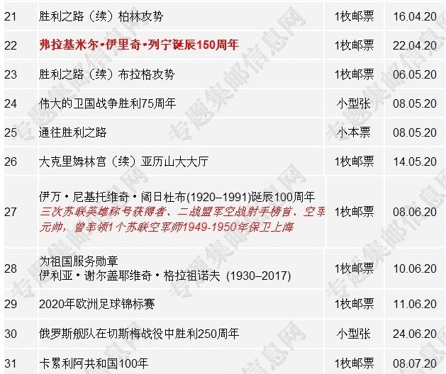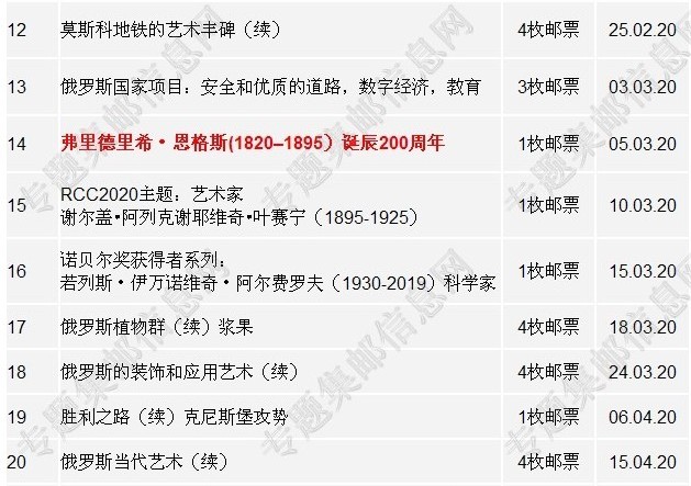 俄罗斯2020年新邮发行计划(暂定计划)
