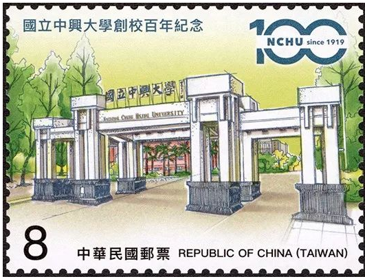 一、面值8元郵票:位于台中市興大路的中興大學校門,採德國柱式設計,兼含中國牌坊造型,爲出入該校必經之樞紐,校園内重要的建築表徵。