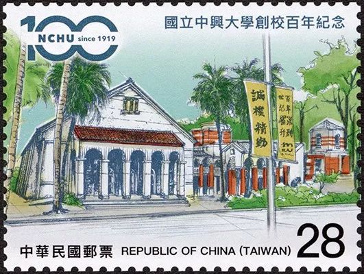 二、面值28元郵票:小禮堂爲中興大學校園内僅存的早期代表性建築,早期爲講堂,提供集會、演講和文康等多元用途,現今爲學生重要的展覽及表演場所,是許多校友的重要共同回憶。