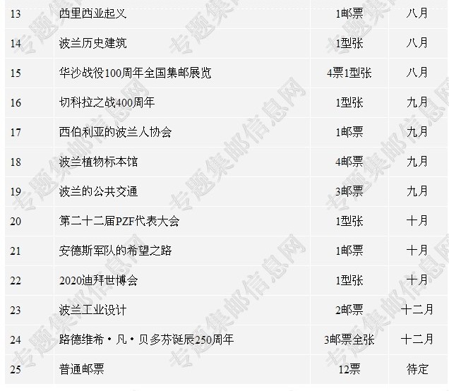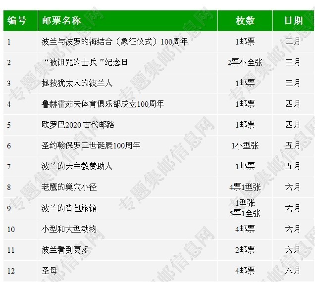 波兰2020年新邮发行计划 波兰2020年邮票发行计划...