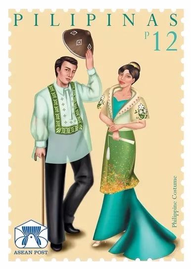 2019年8月9日,菲律宾邮政发行一枚今年的东盟系列邮票,主题为民族服饰。菲律宾男士的传统礼服叫巴隆他加禄,是一种丝质服装,形同衬衣,是男士社交场合的正式礼服,被誉为菲律宾男子的国服。菲律宾女子的国服叫特尔诺,是由菲律宾前总统夫人科拉松-阿基诺夫人身体力行推广开的。特尔诺是一种用菠萝纤维布料做成的圆领短袖连衣裙,也叫蝴蝶服,是女性出席社交场合的正式礼服。