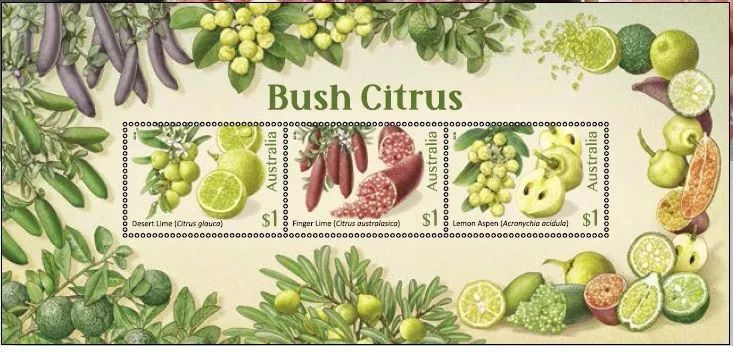 2019年8月13日,澳大利亚邮政发行一套三枚《灌木柠檬》邮票和一枚小全张。灌木柠檬是生长于澳大利亚亚热带地区的柠檬品种,非常硬且皮厚,具有纯正的柠檬味,其果皮可以用于烹饪。三枚邮票上的品种分别是澳洲荒漠柠檬、酸山油柑和澳洲指橙。
