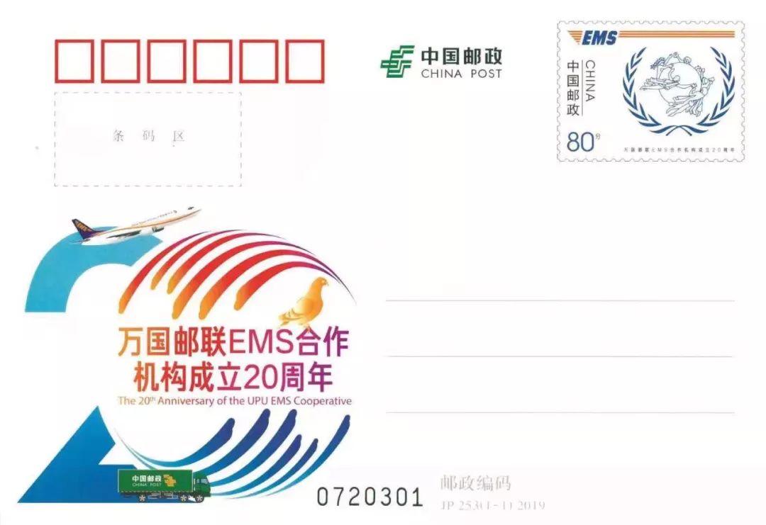 中国邮政定于2019年9月10日发行《万国邮联EMS合作机构成立20周年》纪念邮资明信片1套1枚。详情如下: