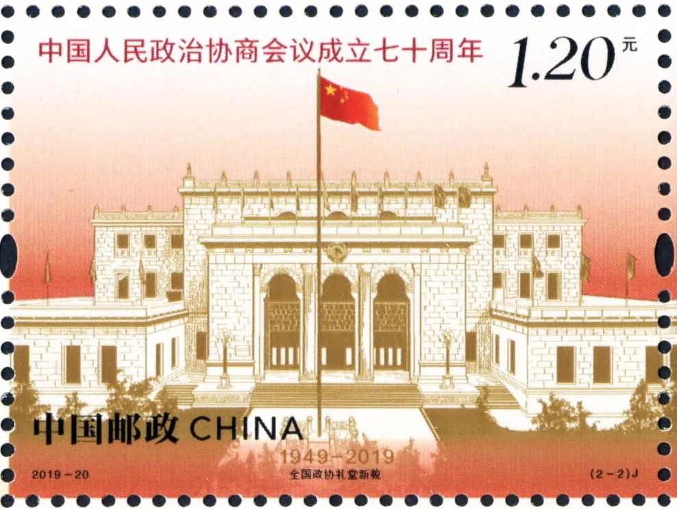中国邮政定于2019年9月21日发行《中国人民政治协商会议成立七十周年》纪念邮票1套2枚,邮票图案名称分别为:人民政协七十周年、全国政协礼堂新貌,全套邮票面值为2.40元。