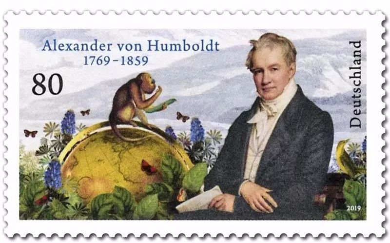 2019年9月5日,德国邮政为近代地理学的主要创建人亚历山大·冯·洪堡(Alexander von Humboldt,1769—1859)诞辰250周年发行一枚纪念邮票。德国地理学家和博物学家亚历山大·冯·洪堡是19世纪的科学界中最杰出的人物之一。他走遍了西欧、北亚和南、北美洲进行研究,被称为气象学、地貌学、火山学和植物地理学的创始人之一。为纪念洪堡,德国建有洪堡基金会,资助世界各国的自然科学研究。