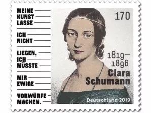 2019年9月5日,德国邮政发行一枚邮票纪念克拉拉舒曼诞辰200周年。克拉拉嫁给了父亲的学生舒曼,舒曼去世后,他的学生勃拉姆斯对她一往情深。其实,克拉拉本人是一位天才钢琴家,还是一位作曲家,曾被认为是第一位背谱演奏的钢琴家。1837年12月14日,克拉拉在维也纳首次公开演出,奥地利皇后也到场了。钢琴家这如此这般形容自己的维也纳首演:"我的胜利"。演出结束后,她应观众的热烈欢呼出来谢幕有12次之多。