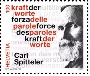 2019年9月5日,瑞士邮政发行一枚邮票纪念卡尔·斯皮特勒获得诺贝尔文学奖百年。卡尔·斯皮特勒(Carl Spitteler,1845—1924)因其长诗《奥林匹亚的春天》而获得1919年的诺贝尔文学奖。《奥林匹亚的春天》是一部约有2万行的巨型史诗。主要描写了奥林匹亚王位从克罗诺斯向宙斯转移的故事。