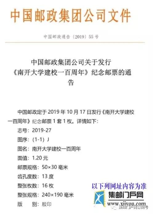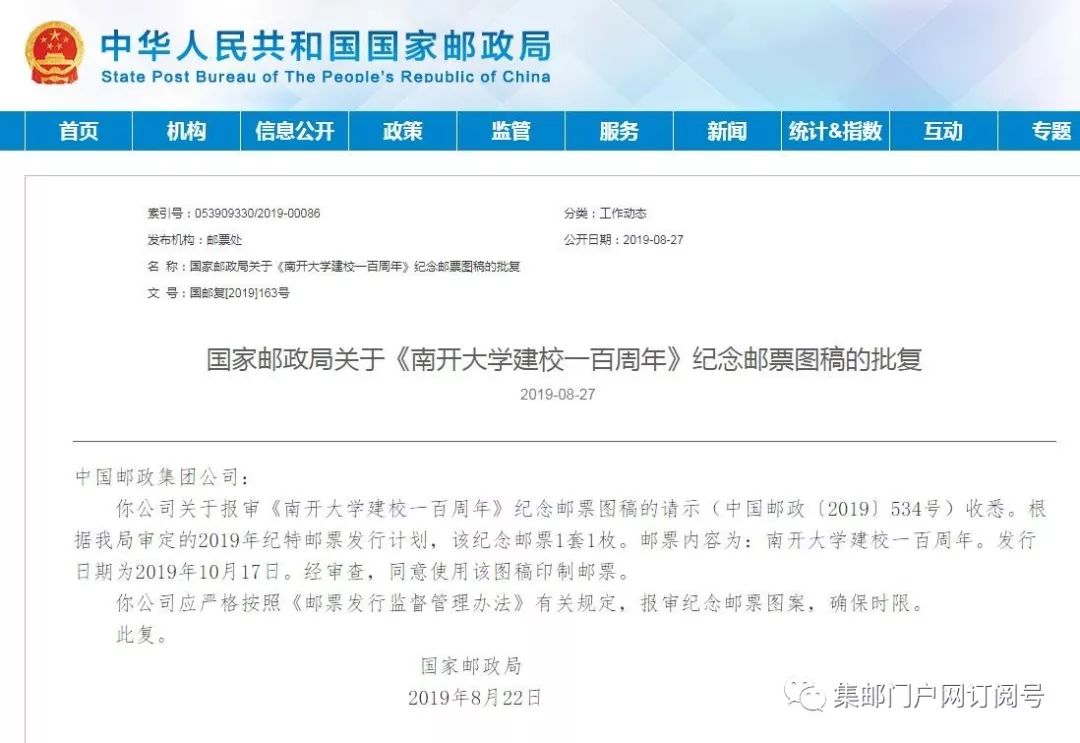 【邮票图案亮相】《南开大学建校100周年》纪念邮票图案亮相、发行公告 日期:2019-09-19 集邮 集邮门户网订阅号 今天 点击“阅读原文”订购《南开大学100年》邮票、大版张原地首日实寄封、总公司封、极限片(本征订南开大学学生凭学生证、毕业生优惠)