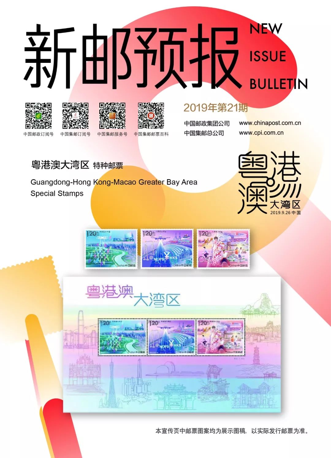 中国邮政定于2019年9月26日发行《粤港澳大湾区》特种邮票1套3枚,小全张1枚。详情如下: