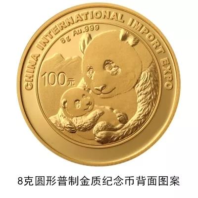8克圆形金质纪念币背面图案为母子熊猫图,并刊“8g Au.999”字样、“中国国际进口博览会”英文字样及面额。