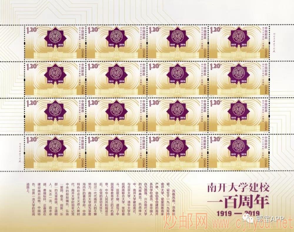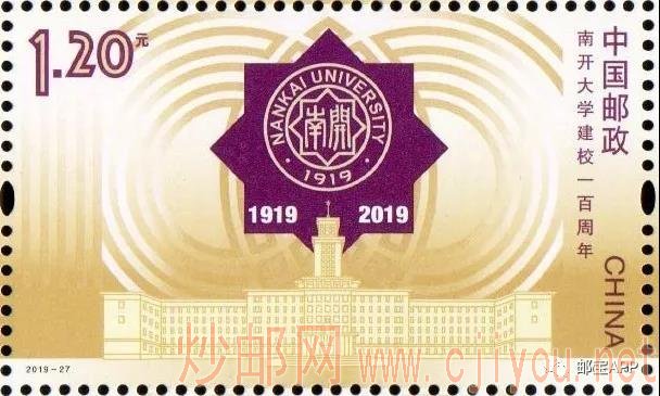 中国邮政定于2019年10月17日发行《南开大学建校一百周年》纪念邮票1套1枚。详情如下: