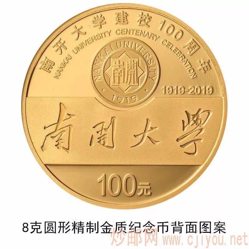 8克圆形金质纪念币背面图案为南开大学校名及校徽等组合设计,并刊“南开大学建校100周年”中文字样、“NANKAI UNIVERSITY CENTENARY CELEBRATION”英文字样、“1919-2019”及面额。