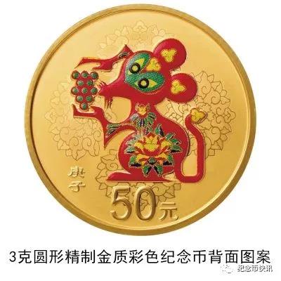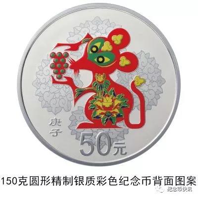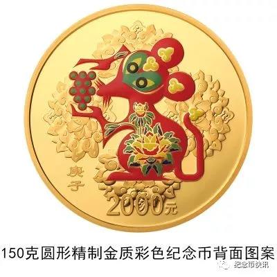 3克圆形金质彩色纪念币、150克圆形金质彩色纪念币、30克圆形银质彩色纪念币、150克圆形银质彩色纪念币等4枚金银纪念币背面图案均为中国民间传统装饰鼠造型,衬以吉祥纹饰(局部彩色),并刊面额及“庚子”字样。