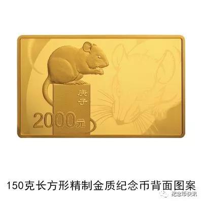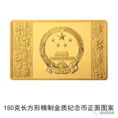 (九)150克长方形金质纪念币为精制币,含纯金150克,规格64毫米×40毫米,面额2000元,成色99.9%,最大发行量1000枚。