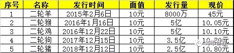 我们来看看上面的表,从2015年开始,生肖纪念币进入了第二轮,第一枚是生肖羊纪念币,发行量只有8000万枚,又是第二轮的首枚,所以目前成交价在45元。此后二轮猴突然放量到5亿枚,市场无法消化,所以到目前为止价格也只是面值附近。
